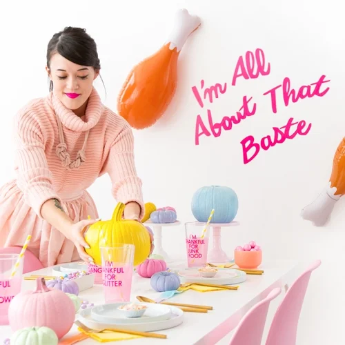 We’ve finally made it to my favorite season: the holidays! I’m so excited to be teaming up with Walmart.com to show you some fun Friendsgiving decor ideas and how to throw an awesome pastel party on a budget! All of the projects we’re going to show you can be completed in two steps or less, so you’ll have extra time to make sure that turkey comes out really yummy and the pumpkin pies are made. Walmart.com has SO many items that you can choose from to make your Friendsgiving parties feel special, so make sure to not only check out what we’re showing you, but see if you can find something else you love, too!